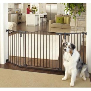 Entire barrier swings open on both sides with child-proof safety latch on both ends.